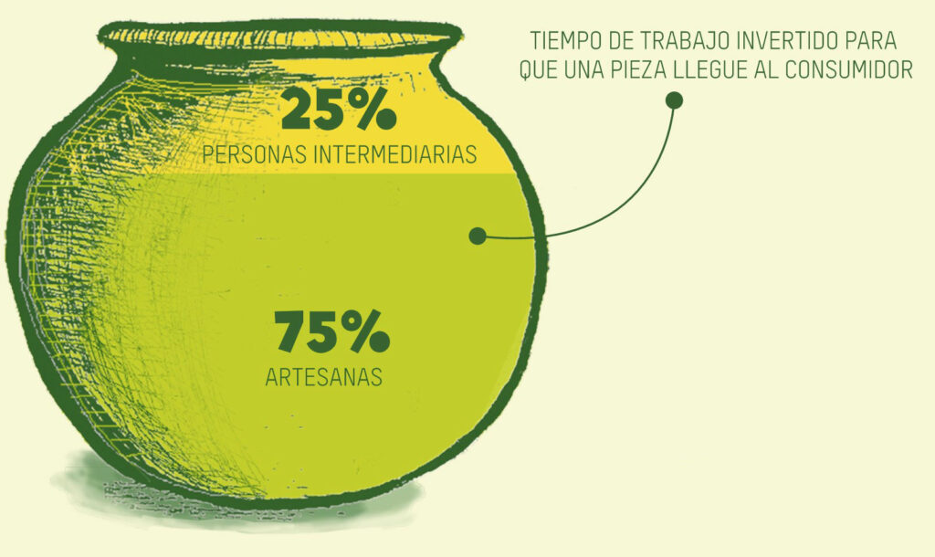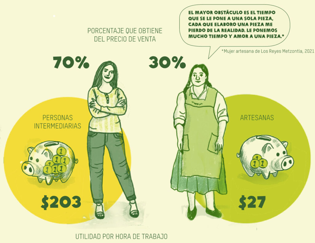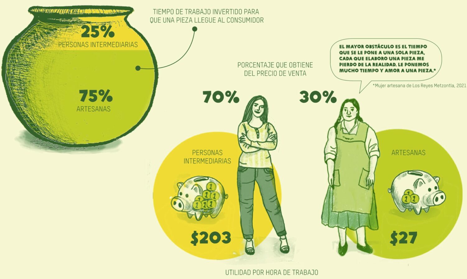 - Las mujeres artesanas confían la venta a personas intermediarias ante la falta de tiempo, contactos y transporte, lo cual dificulta el traslado de piezas pesadas y frágiles.