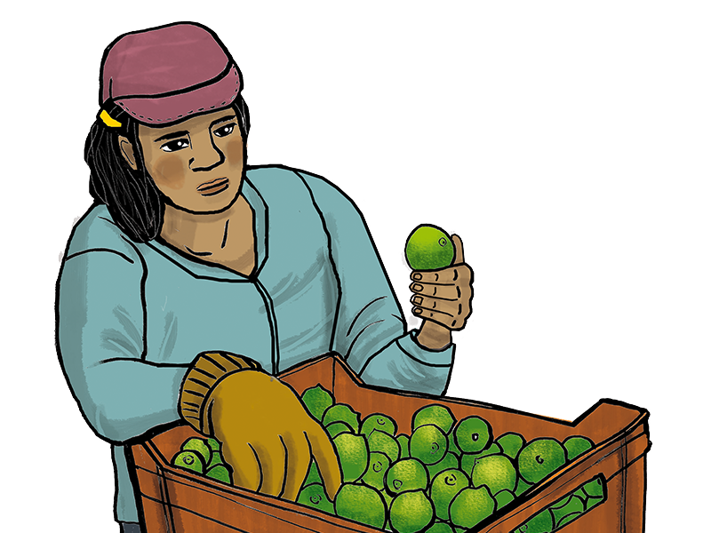 Como Rosario, cada vez es más frecuente que las mujeres se involucren en tareas de producción y comercialización, aunque lo más común es que sean hombres quienes hagan el trabajo de negociación con las y los intermediarios. En cada hectárea de tierra, Rosario cosecha 15 rejas de limón cada 15 o 20 días, lo que equivale a unos 375 kilogramos o 9.12 toneladas al año, un trabajo pesado que realiza junto con las y los jornaleros que contrata. Los hombres de su familia, su esposo e hijos, se encargan de tareas como el riego manual con cubetas, la preparación del suelo, la siembra, la fertilización y el control de plagas.