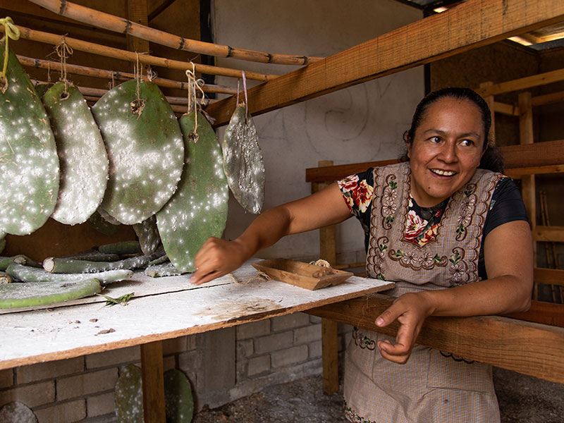 Aurora cultiva en una parcela comunitaria de media hectárea nopales que servirán para obtener la tintura de color rojo a través de la grana cochinilla, así como la planta marush, de la cual extrae el colorante amarillo canario. Además, siembra el jiquilite que, triturado y bajo un proceso de fermentación, proporciona el pigmento azul añil o índigo.